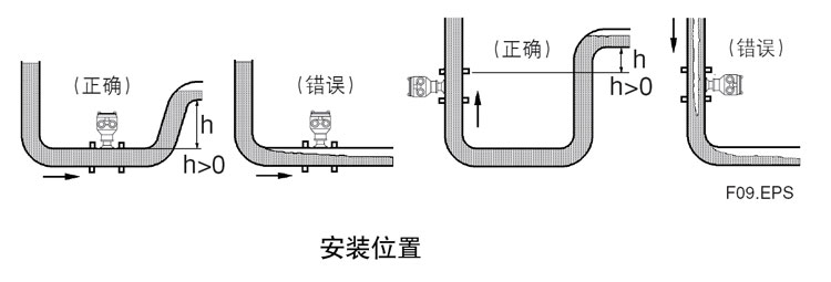 ⑴为了避免由夹附气体引起的测量误差,请观察如下安装方法:见图-1,错误安装—装在管线走向最高点(在测量中容易聚集空气泡)。